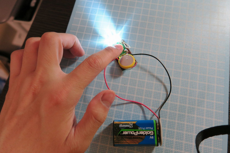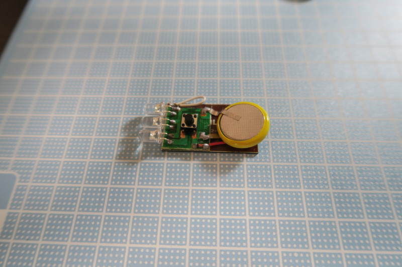 ためしに電池をつないでみる(既存のボタン電池に並列に接続する)とLEDが付きました。