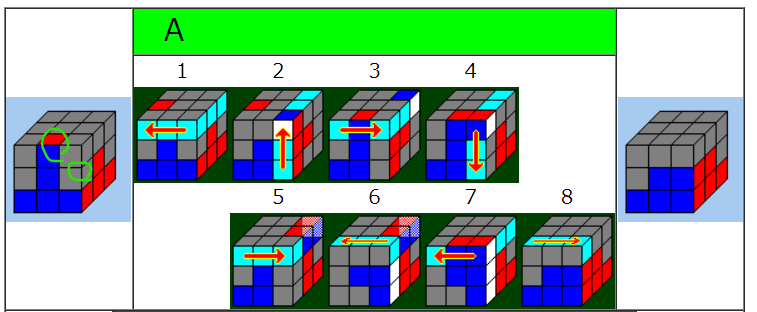 1面はだいたい3手先が読めれば(想像できれば)完成させることが出来ますが、例えば下図のように2段目を完成させる手順の一つ「A」でも8手先まで読まなければならないことになります。