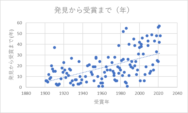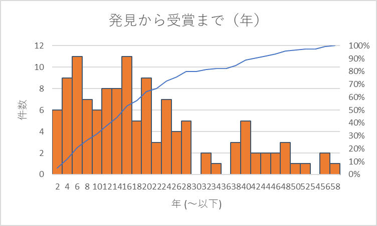 ただし、ここでは「発明・発見から受賞までの年数」はWikipediaに記載された情報(論文があればその発表年、無ければその発明・発見に関する記述がある年)を基準年、対象業績が複数ある場合は、その中で最も古いものを基準にしました。