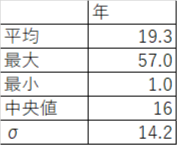 平均は19.3年で噂とほぼ一致しています。また中央値でも16年です。