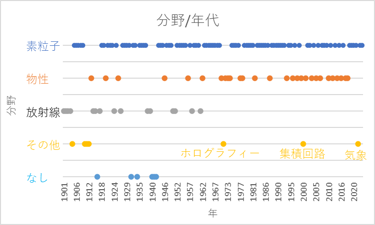 これを年代を合わせて分析すると、初期は放射線関連が多くあります(放射線も本来は物性か素粒子に分類できます)。