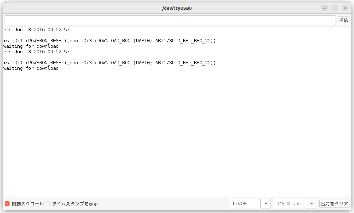 うまく書き込みモードとして接続が認識されると、以下のようなメッセージがシリアルに出力されます。