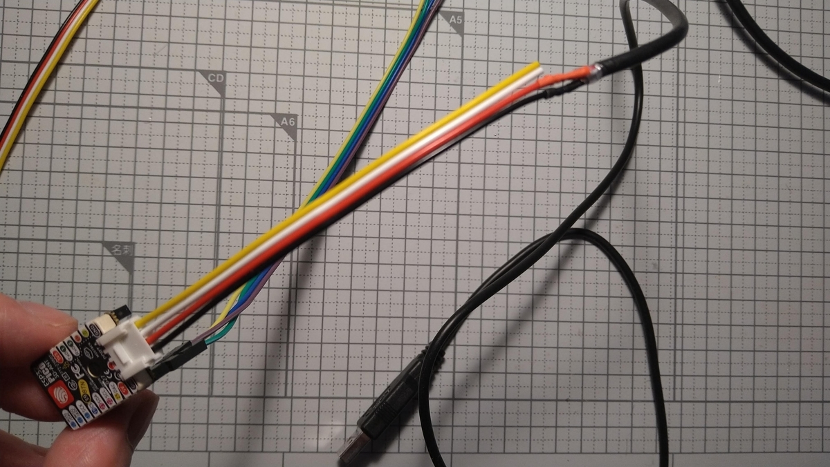 市販のGroveコネクタをカットし、USBの5Vをはんだ付けしました。