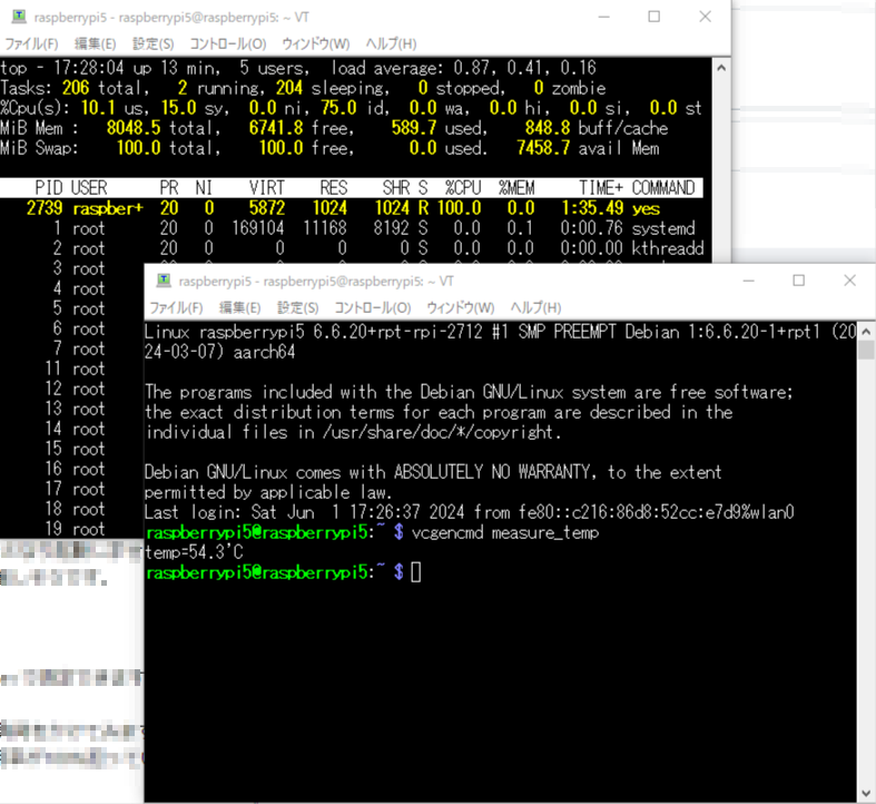 この状態でyes > /dev/nullを実行し負荷をかけてみます。