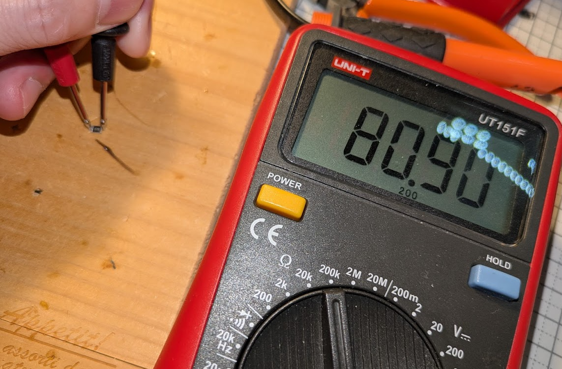 この抵抗を測定してみると、約80kΩでした。